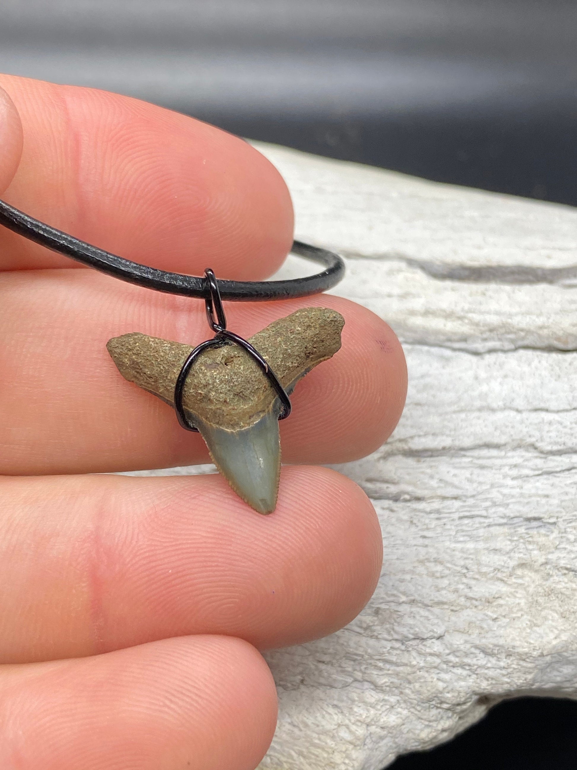 This shark tooth was found in Lee County, FL. It’s a 0.9 inch bull shark tooth wrapped in black wire and assembled on a 16 inch black synthetic leather cord necklace.
