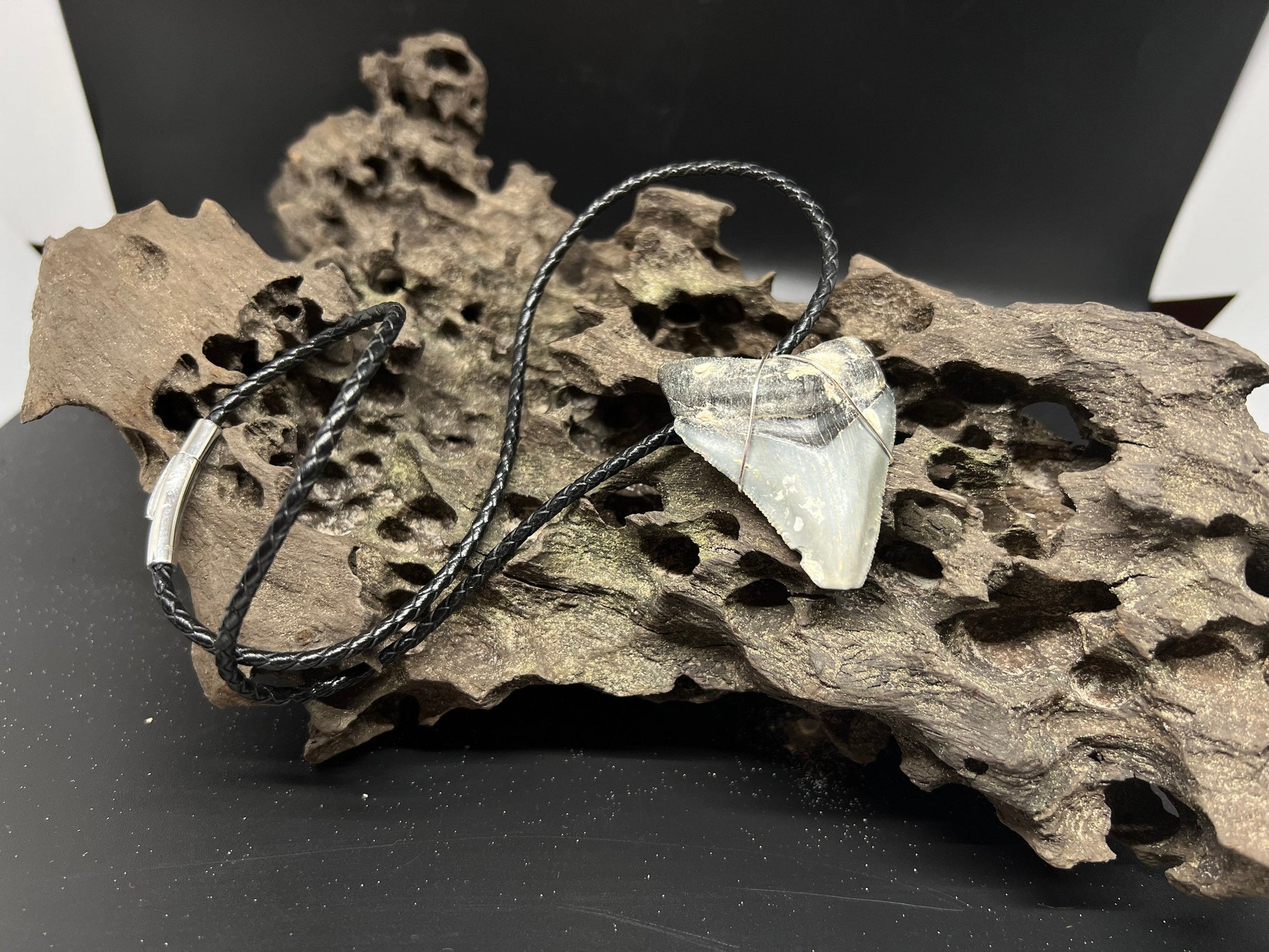 This meg tooth measures 2.1 inches and is wrapped in silver plated wire and assembled on a 20 inch black leather necklace with a stainless steel clasp.