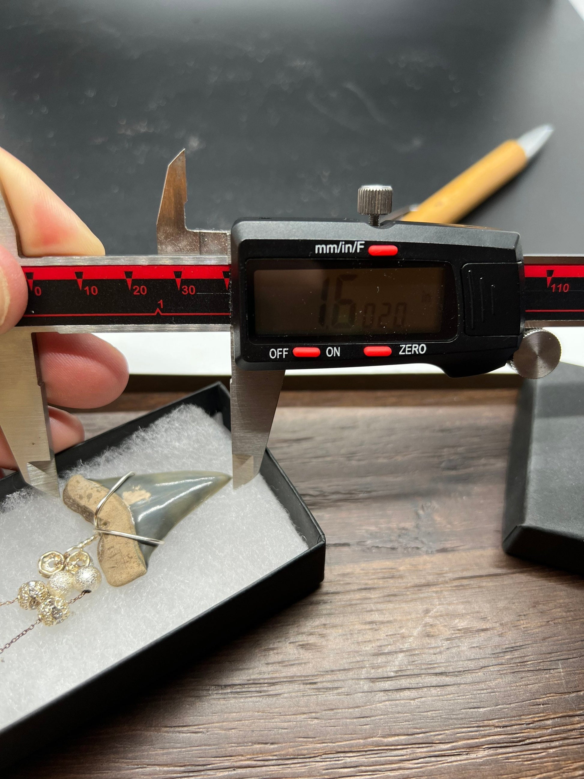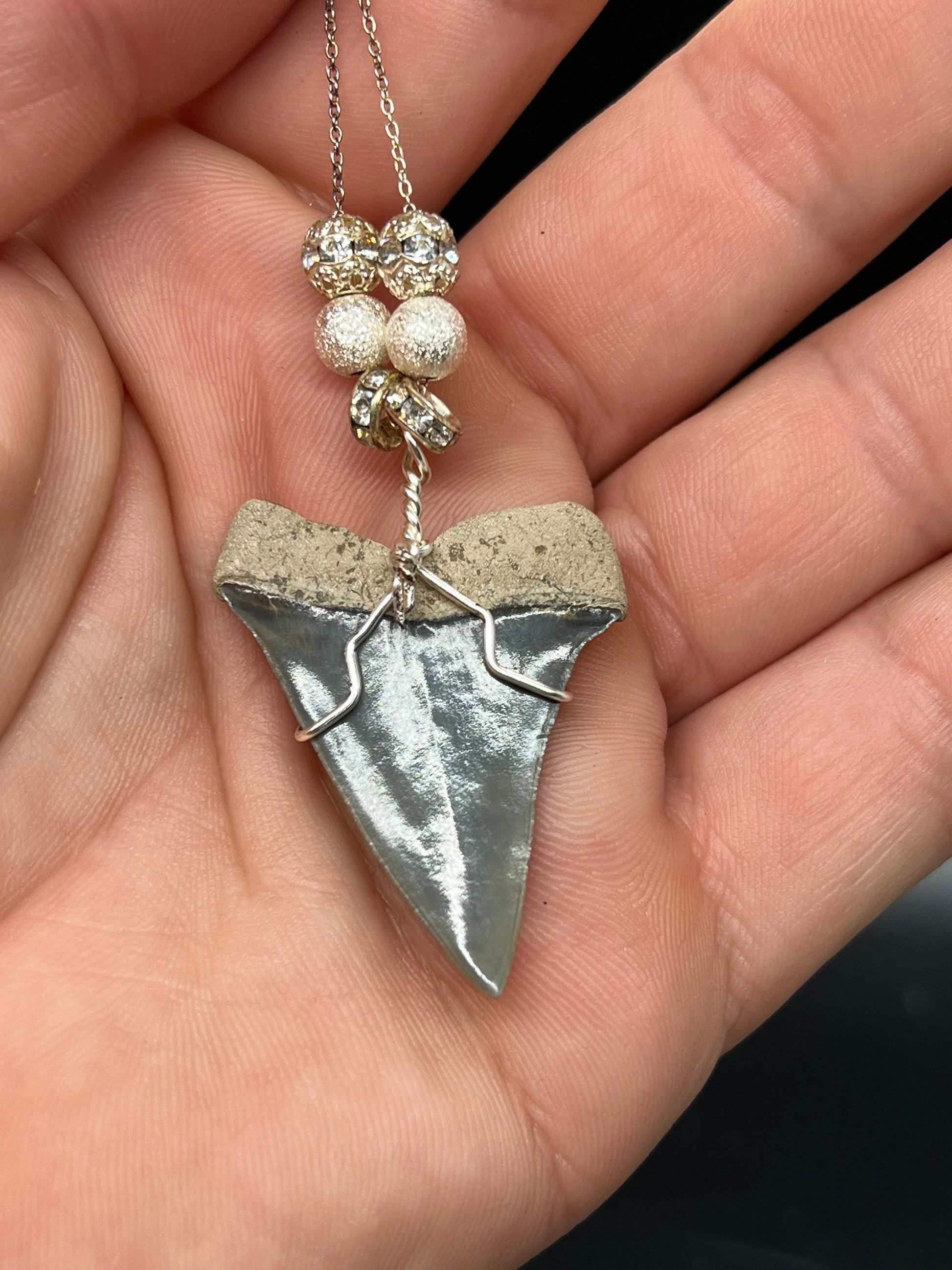 This Carcharodon hastalis (Mako shark, non serrated Great White ). tooth was found in the Peace River. It measures 1.6 inches and is wrapped in silver, non tarnish wire and assembled on a 18 inch sterling silver chain with Beads.