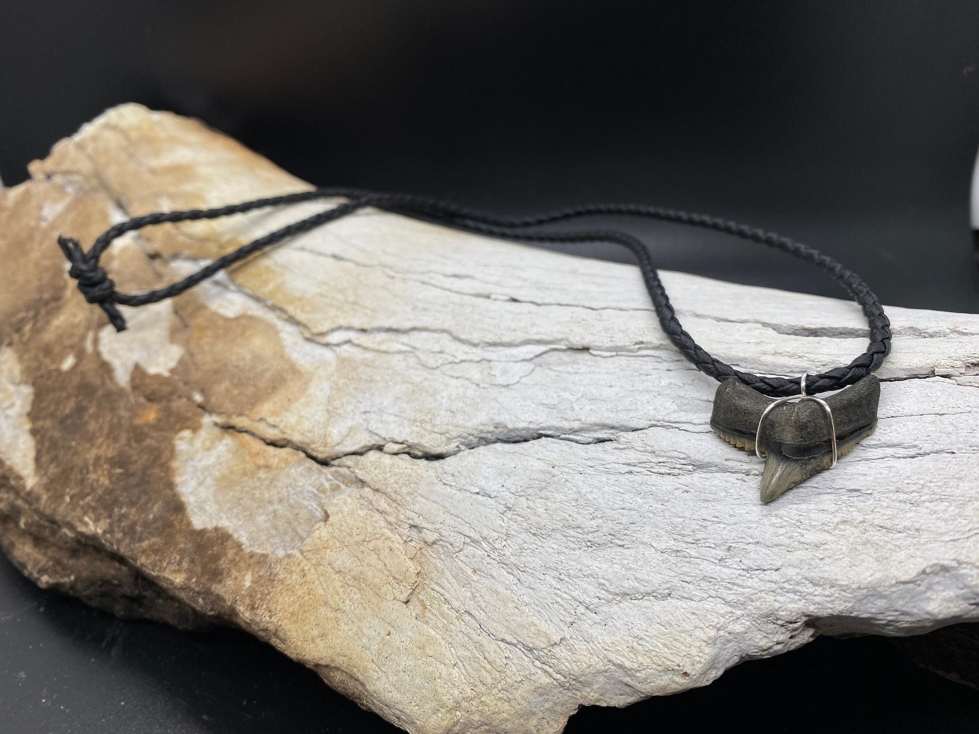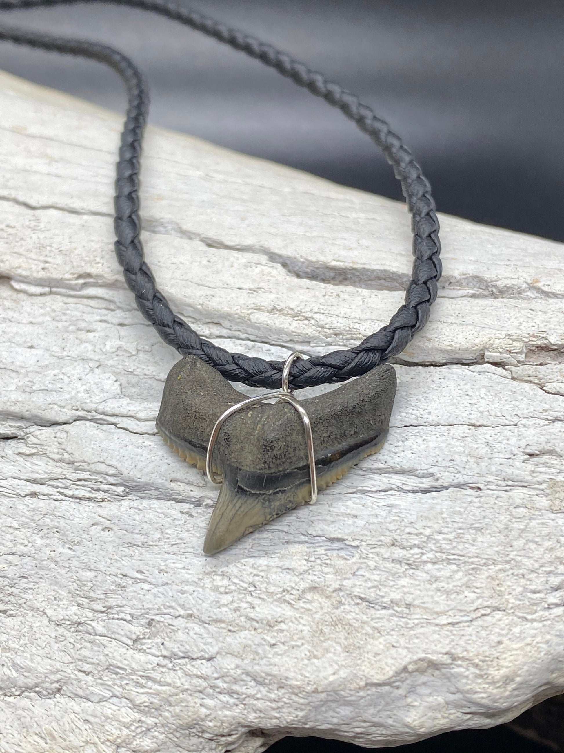 This shark tooth was found in Lee County, FL. It’s a 1.1 inch tiger shark tooth wrapped in silver plated wire and assembled on a 24 inch braided black synthetic leather necklace.
