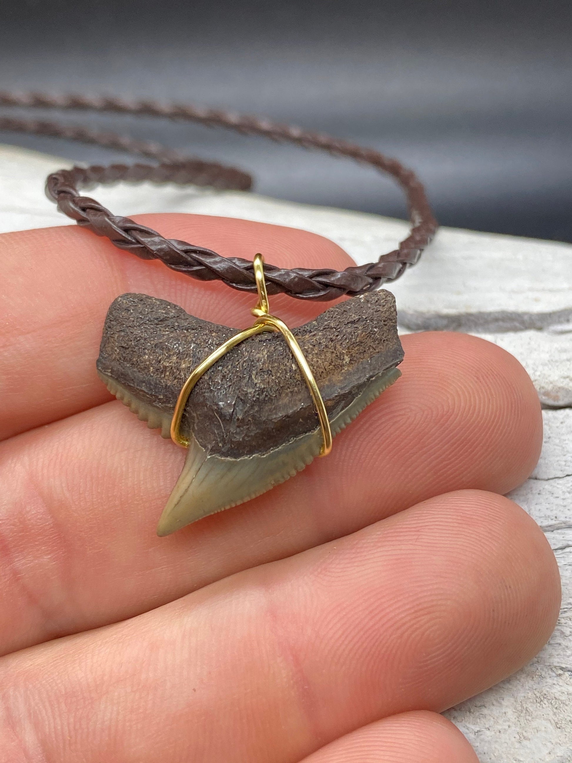 This shark tooth was found in Lee County, FL. It’s a 1.2 inch tiger shark tooth wrapped in gold plated wire and assembled on a 22 inch braided brown synthetic leather necklace.